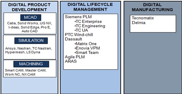 PLM | Teamcenter suite ( Ent., Engg., TCRA, Technomatix, Community etc.) Agile, ematrix, Documentum, Share-A-Space (for data exchange), Daista ( for data integration), Cordys (BPM), PTC, SAP-PLM, ARAS |